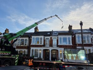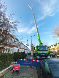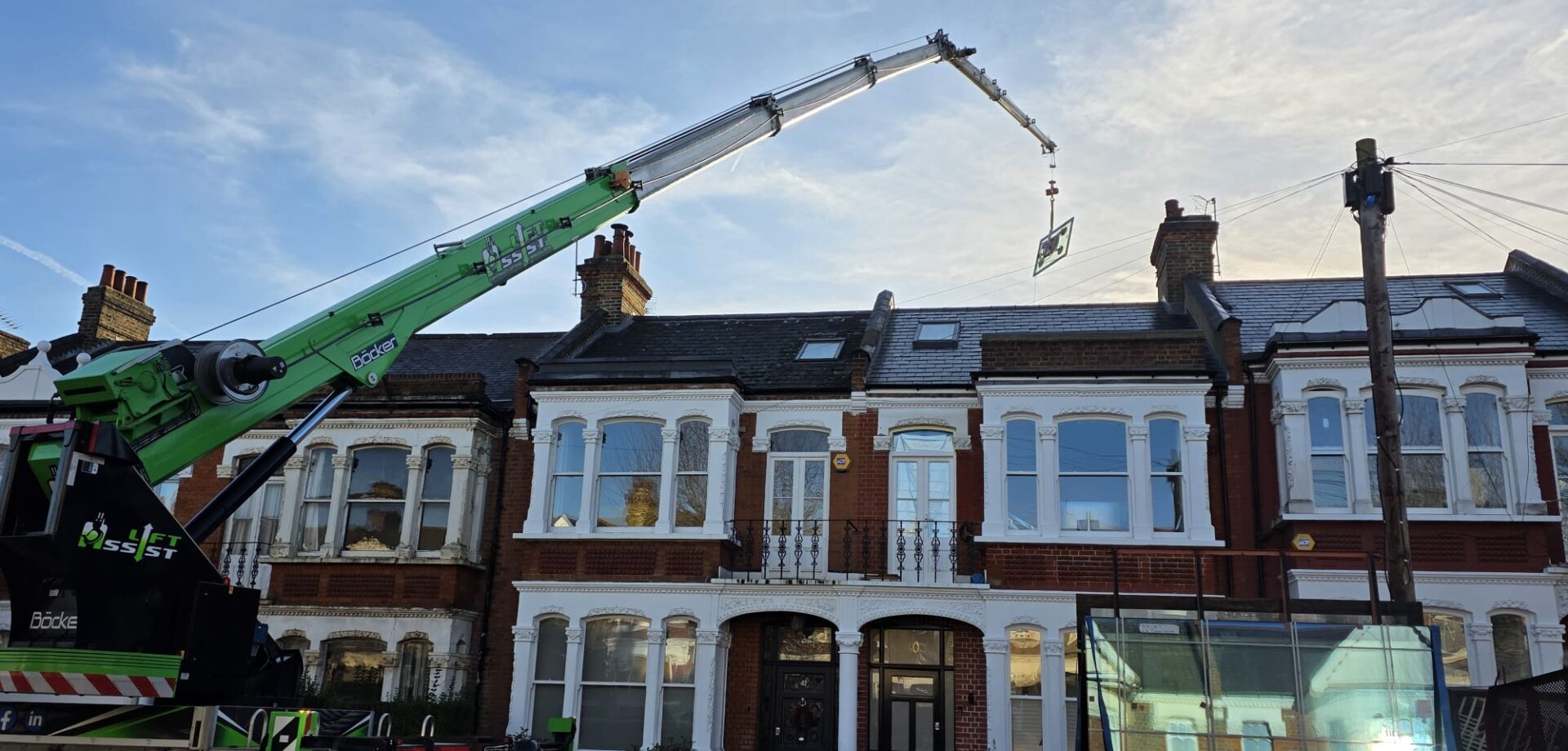 Rutland Cranes was appointed to deliver a full contract lift for a glazing contractor installing six skylights on a terraced property in North West London. With no access for spider cranes and the property located in a densely builtup residential area, the lift required a mobile crane, full traffic management, footpath closure, and parking bay suspension to ensure safe and legal operation.