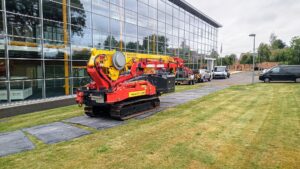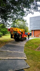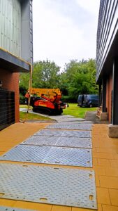 To overcome the access limitations, we deployed a 120-metre trackway system, laid across the lawn and resin-covered courtyard to create a temporary access route for vans and lifting equipment.
