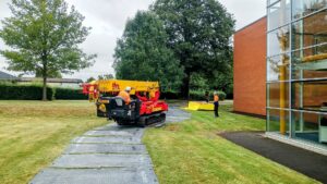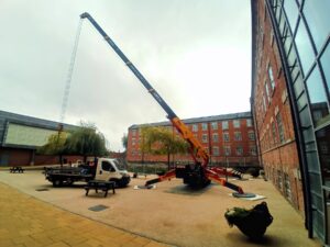 Rutland Cranes was appointed to deliver a full contract lift for the installation of a new sluice at the JCB Academy in Rocester. The project involved lifting operations within courtyard area with no direct road access, requiring a custom access and protection strategy.
